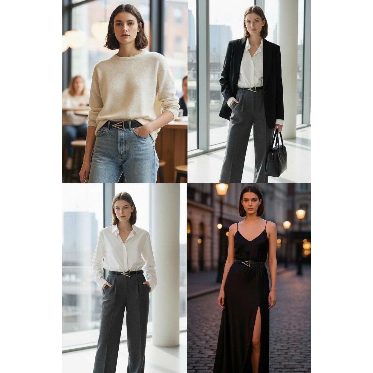 Elevate your style with this chic Bottega Veneta rubber belt. Featuring the brand's signature triangle buckle, this belt is a modern and fashionable accessory. See 2nd picture (AI image) showing styling versatility.