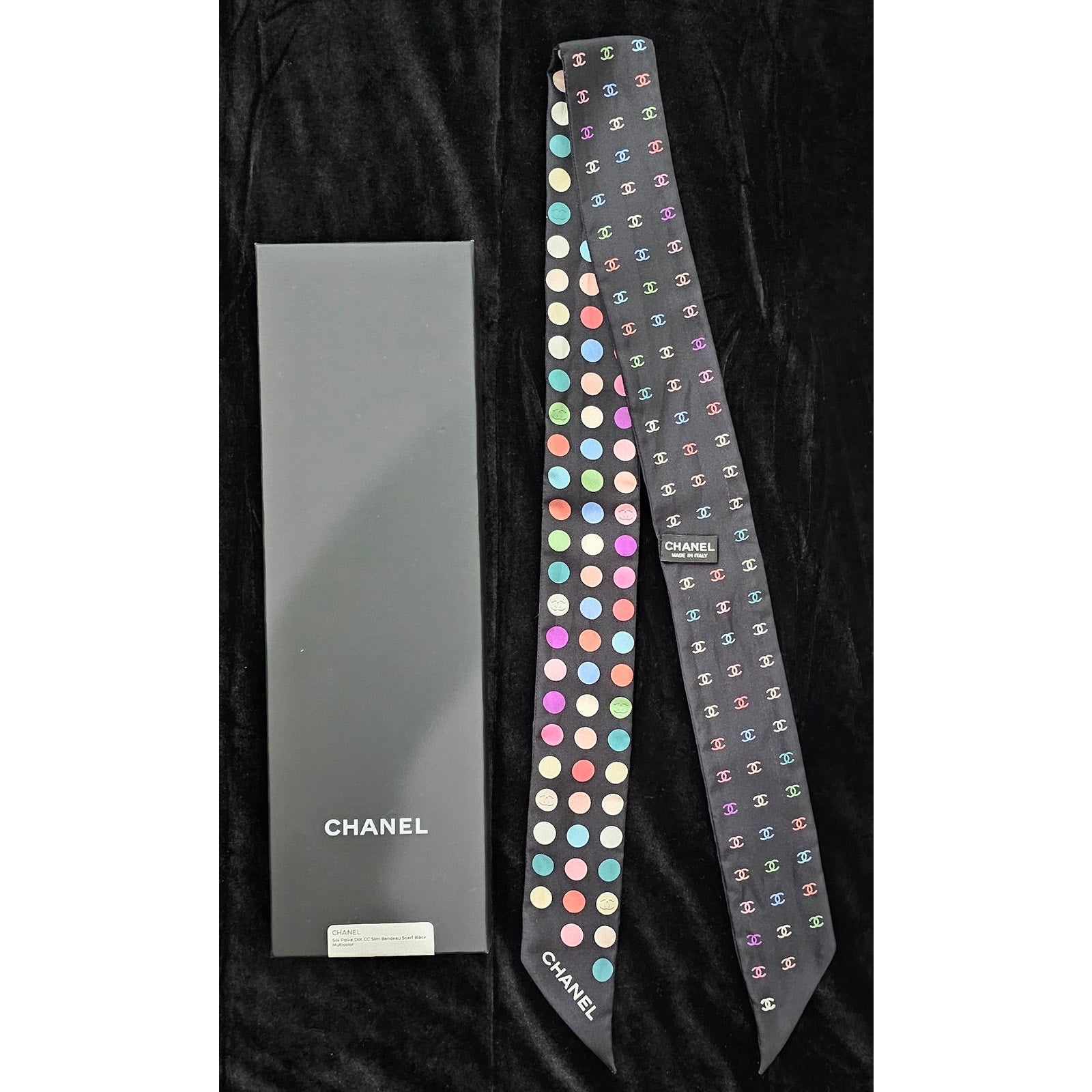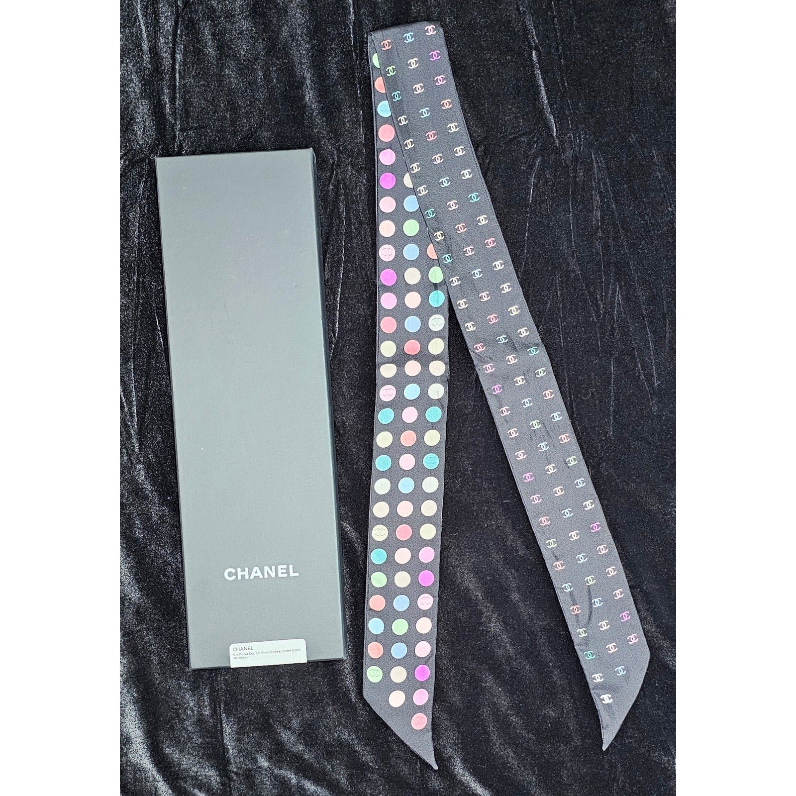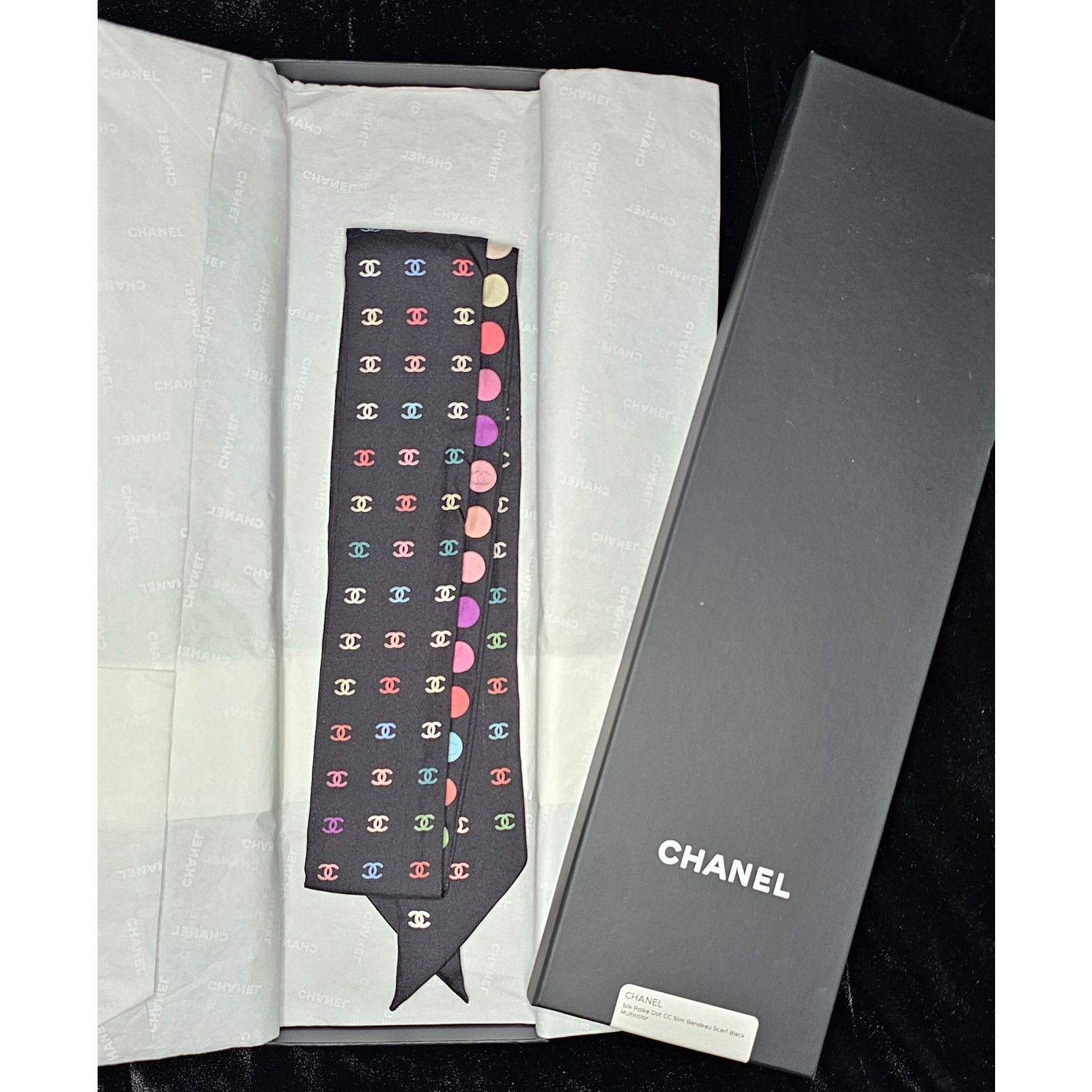 Add a touch of luxury to your wardrobe with this authentic Chanel silk bandeau. This stylish accessory features a playful multicolored dot pattern and iconic Coco Mark logos throughout. Made from high-quality silk, it's soft to the touch and versatile enough to be worn in a variety of ways - as a hair accessory, a neck scarf, or even tied to your favorite handbag.