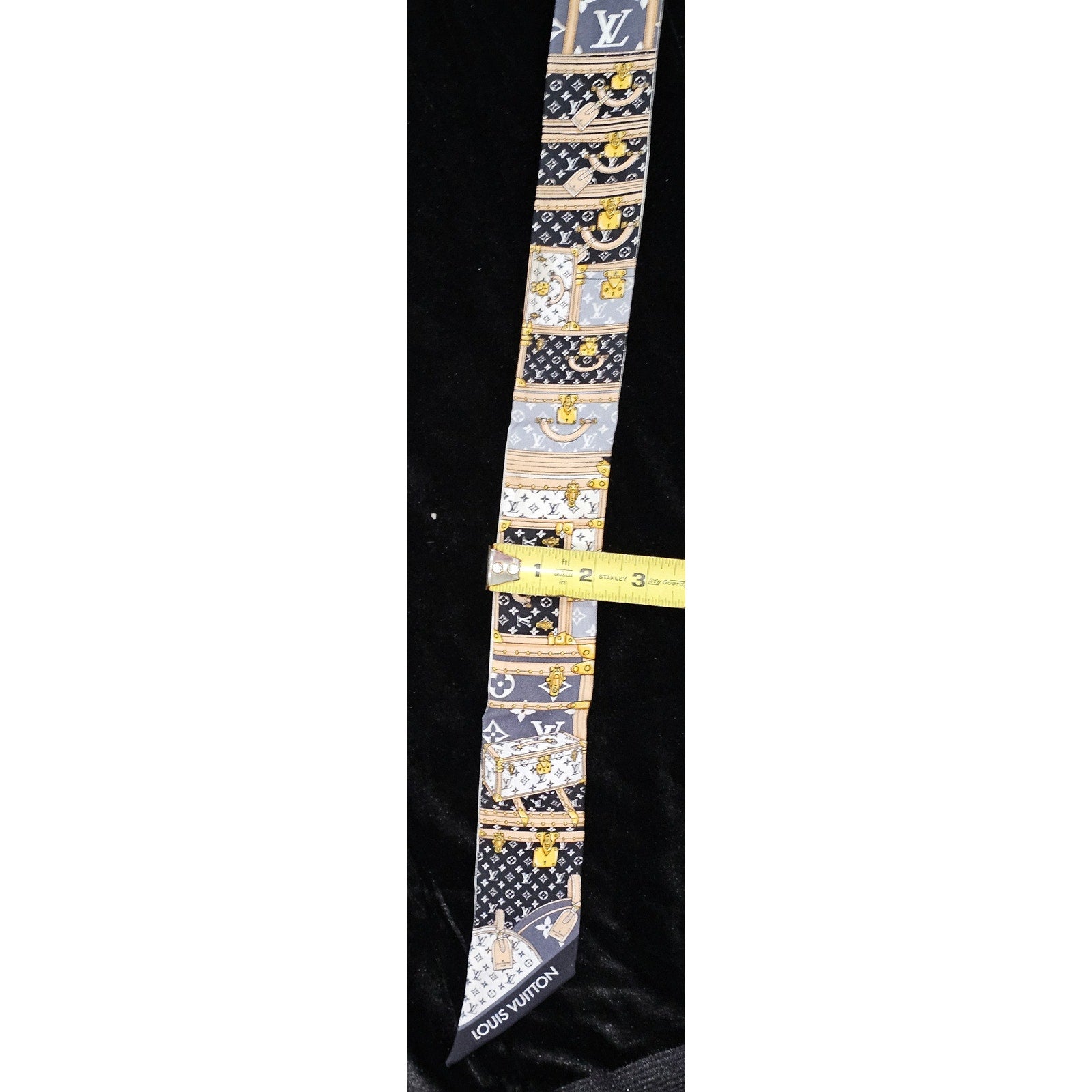 Elevate your style with this stunning Louis Vuitton Monogram Let's Go BB Bandeau. The Let's Go BB bandeau highlights Louis Vuitton's rich history in luggage production with multicolored trunks on one side. The reverse pays homage to the House with the iconic Monogram pattern. These intricate designs are achieved using an inkjet-print technique over the pure silk composition of the scarf.