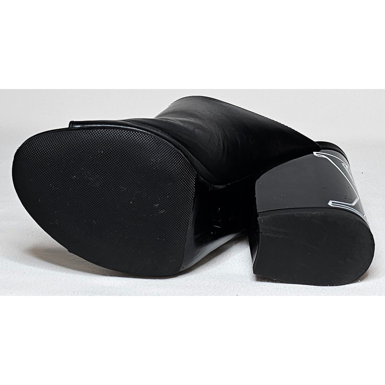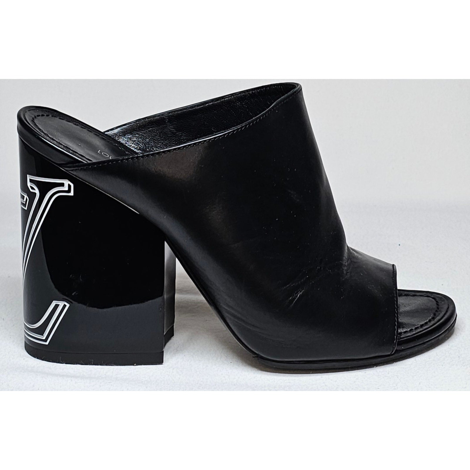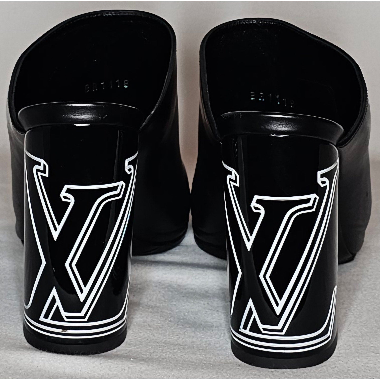 Step out in style with these gorgeous Louis Vuitton Topmost mules in black calf leather with an oversized white LV Initials logo on the block heel.