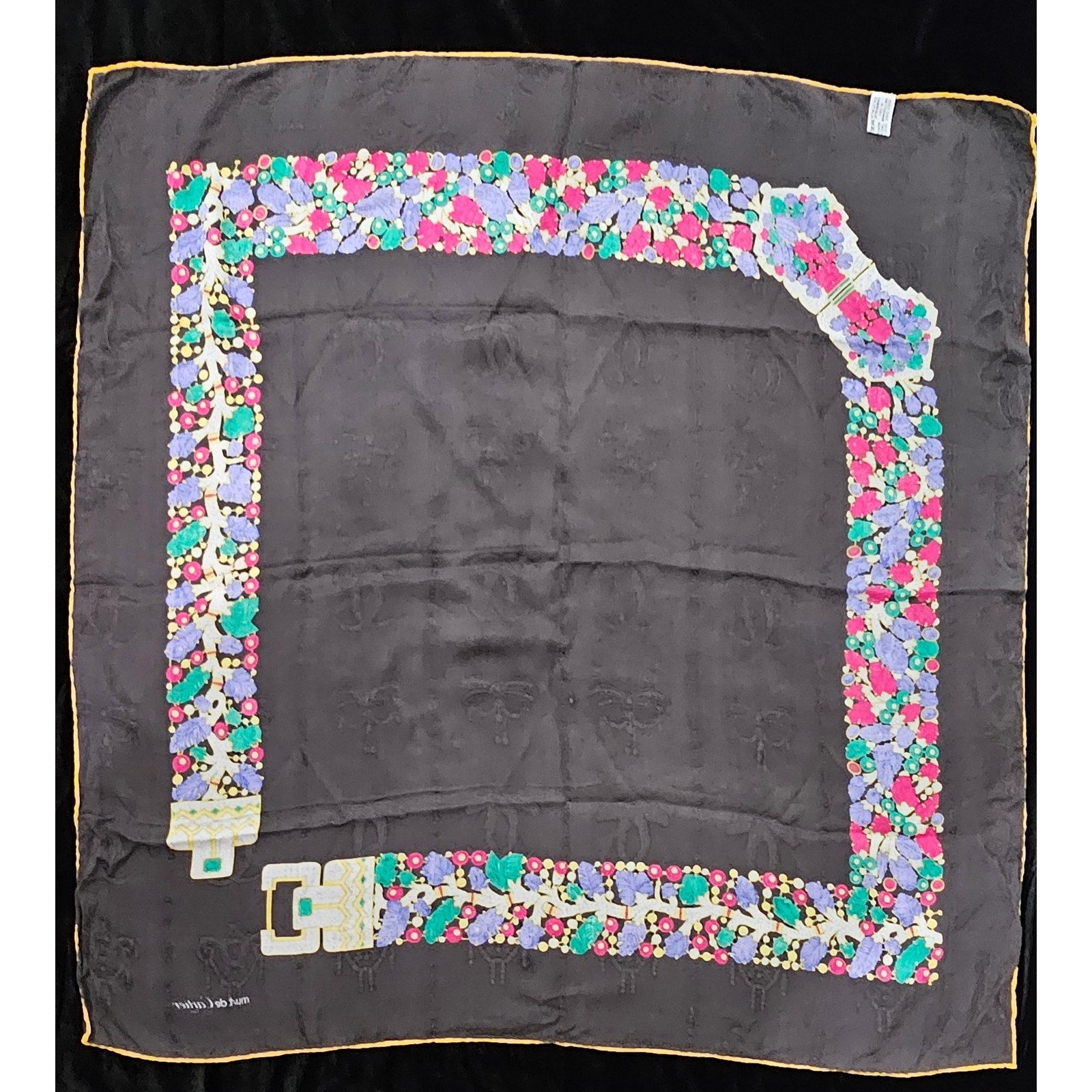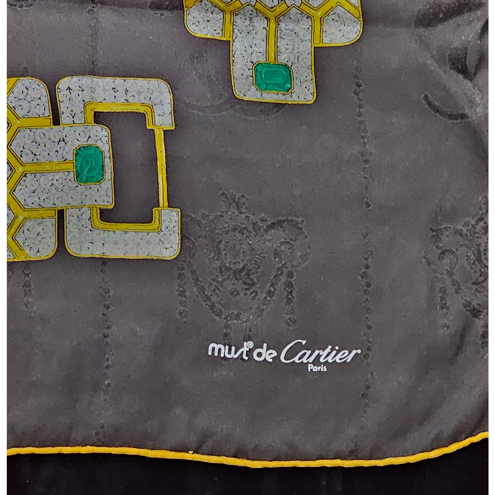 The scarf features a black background with a colorful border resembling a jewelry or belt motif. The border is decorated with red, blue, and green floral or leaf-like patterns with small yellow accents. The design incorporates elements that look like belt buckles or clasps in gold and white. The scarf also has a black on black cartier monogram all over. The signature "must de Cartier" is visible in the bottom right corner. , this scarf is perfect for adding a pop of color and sophistication to any outfit.
