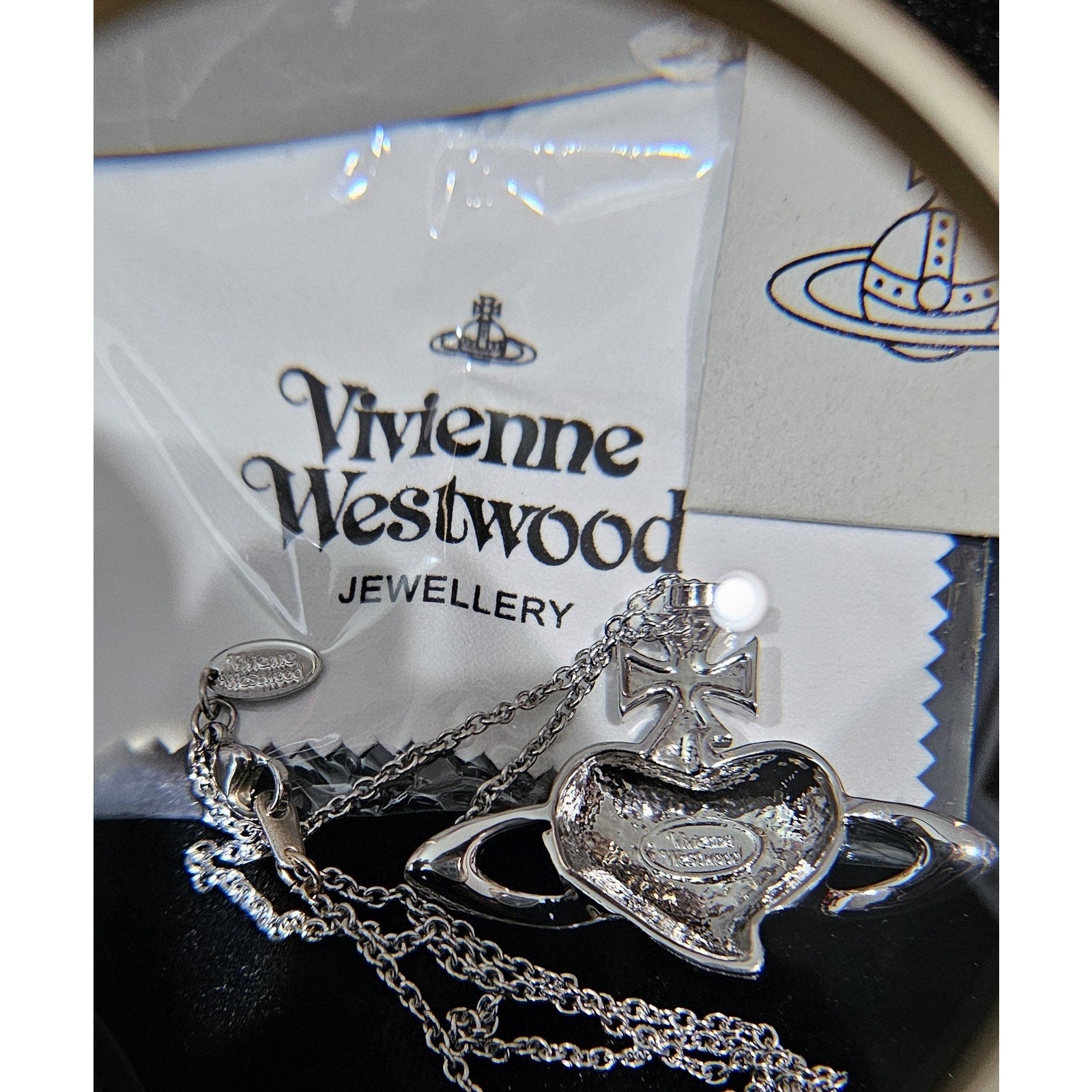 Add a touch of edgy elegance to your look with this iconic Vivienne Westwood necklace! This authentic piece features the signature orb and heart design in a striking silver tone with black accents. It's perfect for adding a rebellious yet sophisticated vibe to any outfit.